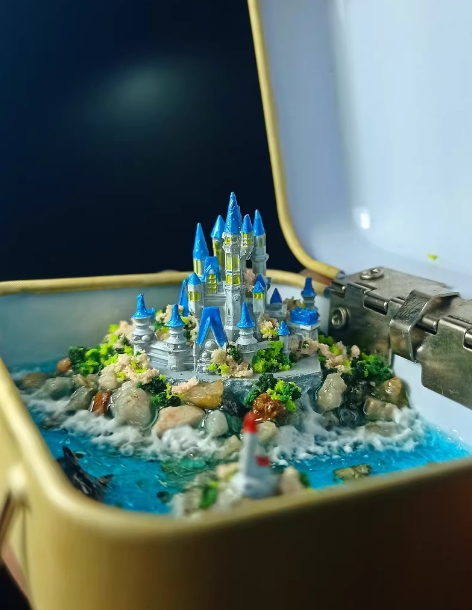 微缩景观摆件,全新,纯手工制作,城堡灯塔蓝眼泪夜光,这个精致的小岛景观放在一个行李箱形状的盒子里,非常适合做礼物或者自己...