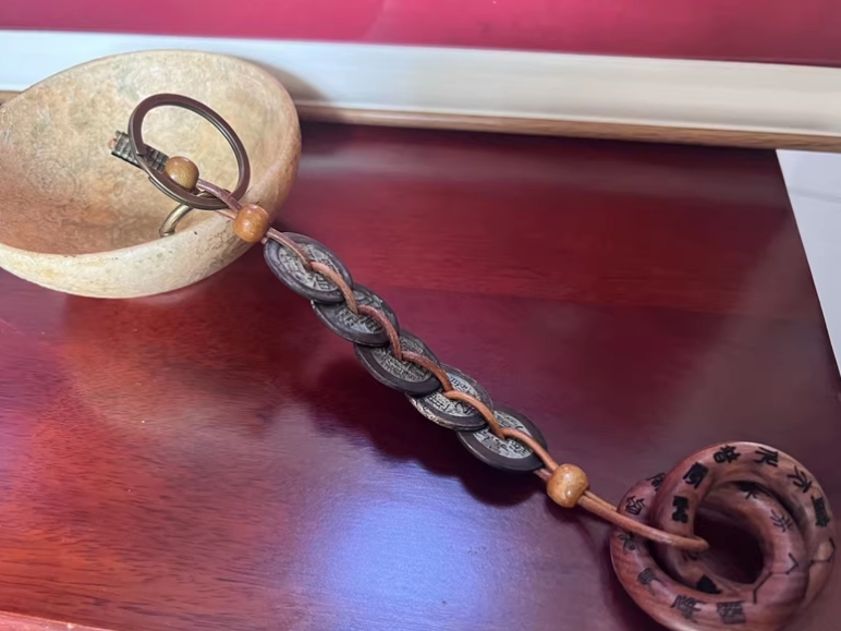工道系乾坤圈(九字真言和十字天经)加五帝钱,可盘玩、可做钥匙扣、吊坠、项链、饰品。(扣环可拆卸)尺寸:总长度21CM